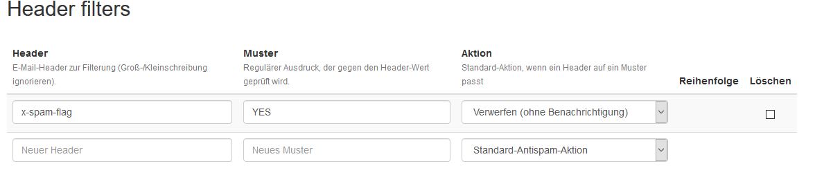 Hier kann eingestellt werden was passieren soll, wenn ein bestimmter Mail Header in der ankommenden Mail gefunden wird.