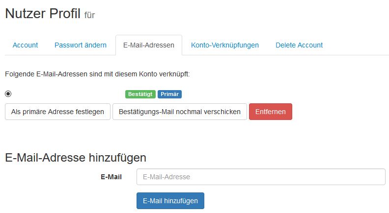 Daraufhin sehen Sie im oberen Teil ihre verknüpften E-Mail-Adressen, ob sie bestätigt sind und welche ihre Primäre Mailadresse ist.