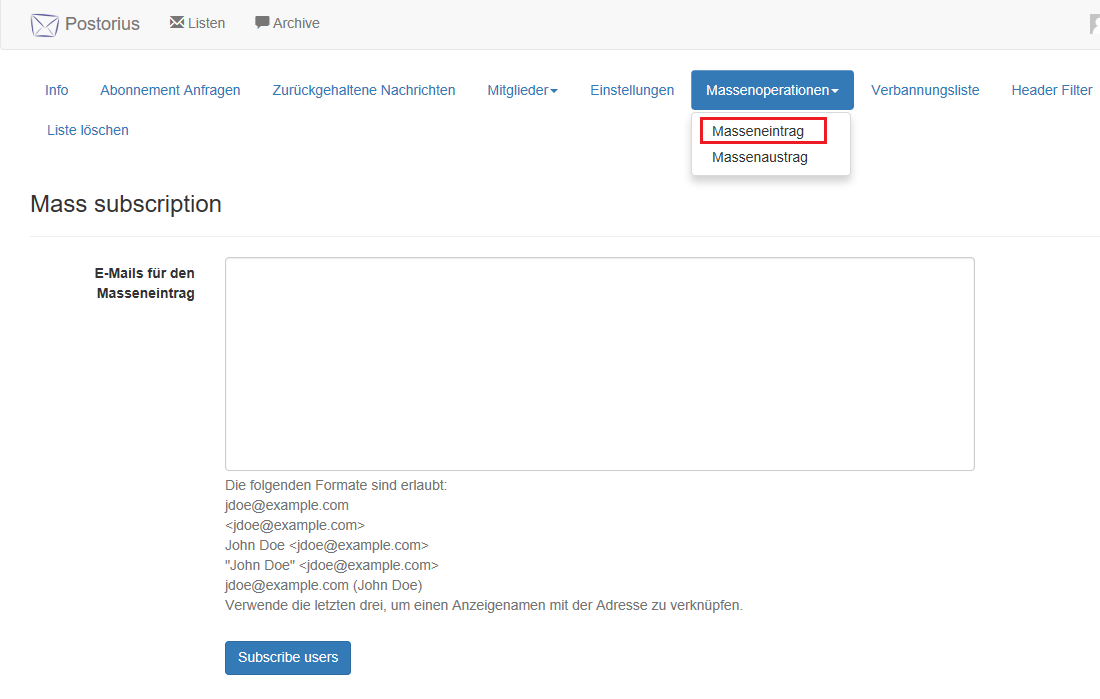 Die neuen Abonnenten werden über den Punkt Massenoperationen > Masseneintrag hinzugefügt. Es muss eine E-Mail-Adresse pro Zeile eingetragen werden.