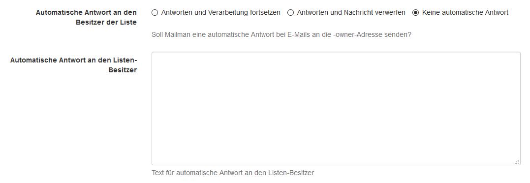 Erhält beispielsweise der Besitzer einer Mailingliste, über die -owner Adresse Anfragen, die automatisch beantwortet werden sollen, so können unter "Automatische Antwort an den Besitzer der Liste" folgende Optionen gesetzt werden: