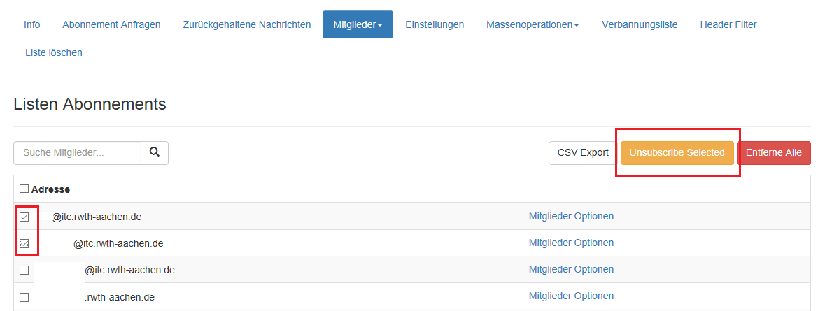 Um Abonnenten zu löschen setzten Sie das Häckchen gegenüber den zu löschenden Abonnenten und anschliessend klicken Sie auf Unsubscribe Selected.