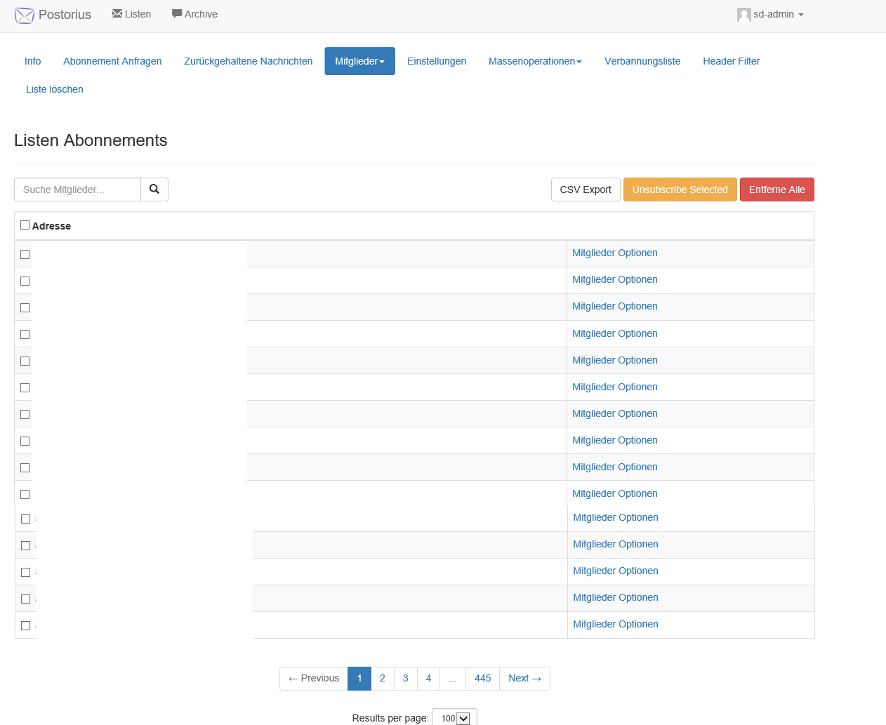 Es muss zudem noch kontrolliert werden, ob die Anzahl der Benutzer übereinstimmt. Dazu muss man im Feld Mitglieder den Punkt Abonnenten auswählen, damit die Benutzeranzahl angezeigt wird. Hierbei empfiehlt es sich, die Anzeige auf 100 Nutzer pro Seite zu erweitern und zu schauen, wieviele Seiten es gibt. Dadurch kann man die ungefähre Anzahl leichter errechnen.