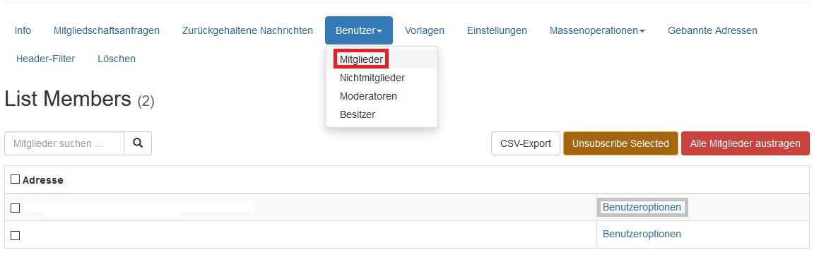 Um zu verhindern, dass ein Abonnent die Nachrichten der Mailingliste erhält, können Sie diese Einstellung tätigen, indem Sie unter dem Punkt Benutzer > Mitglieder den Abonnenten aufsuchen. Klicken Sie dann auf Benutzeroptionen.