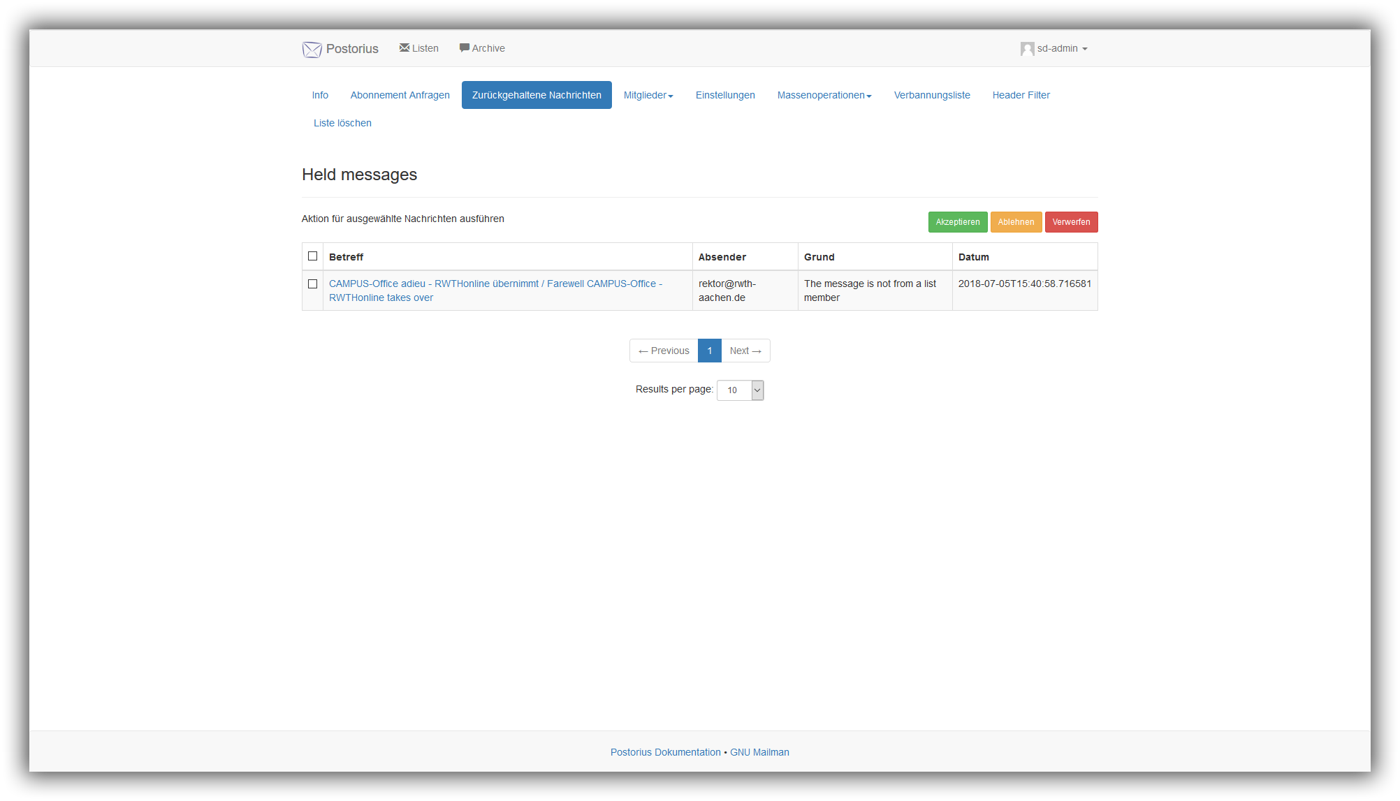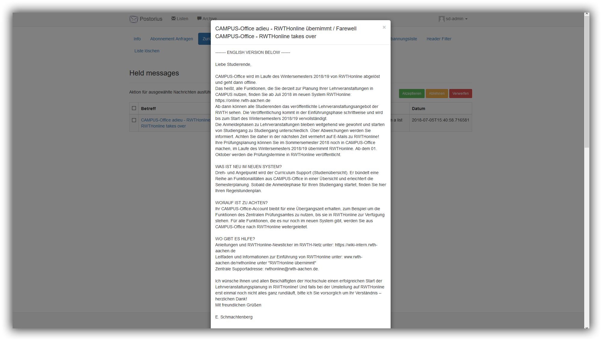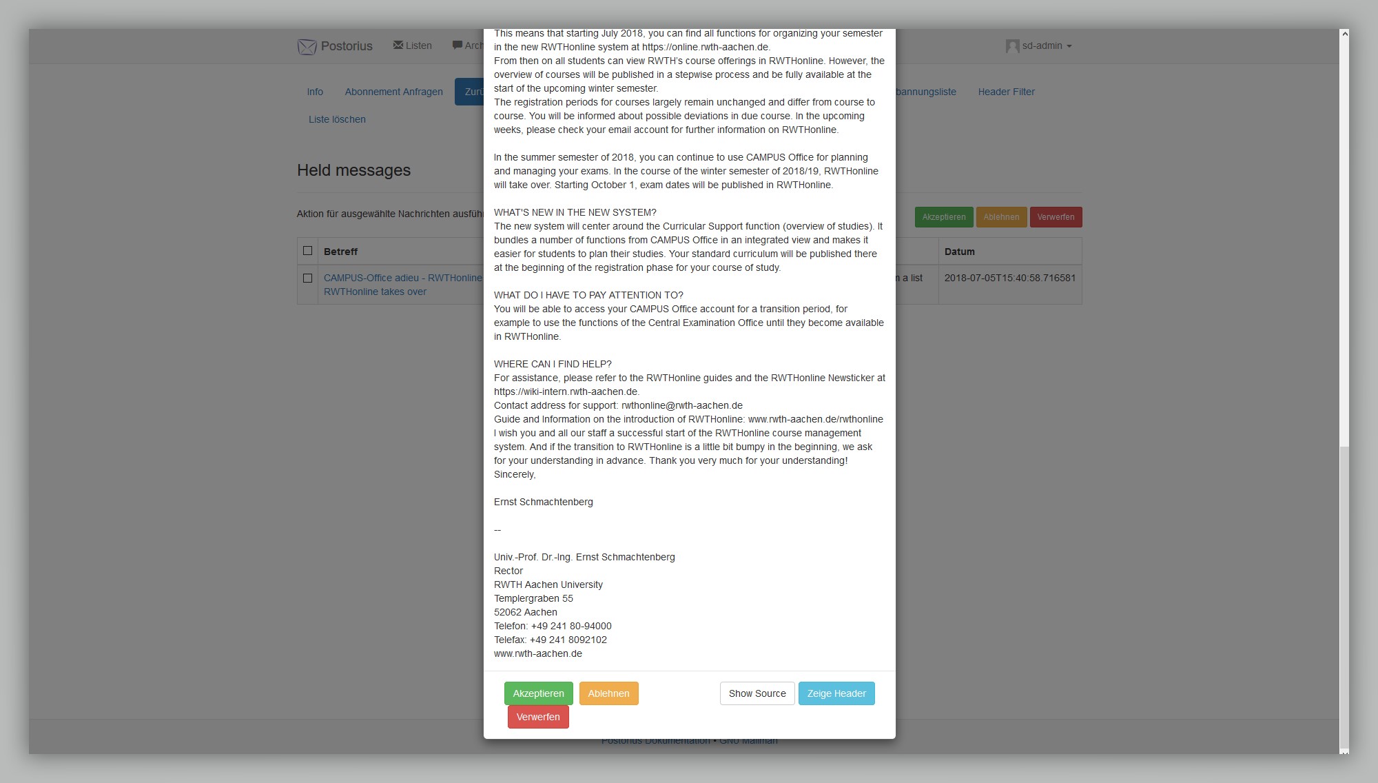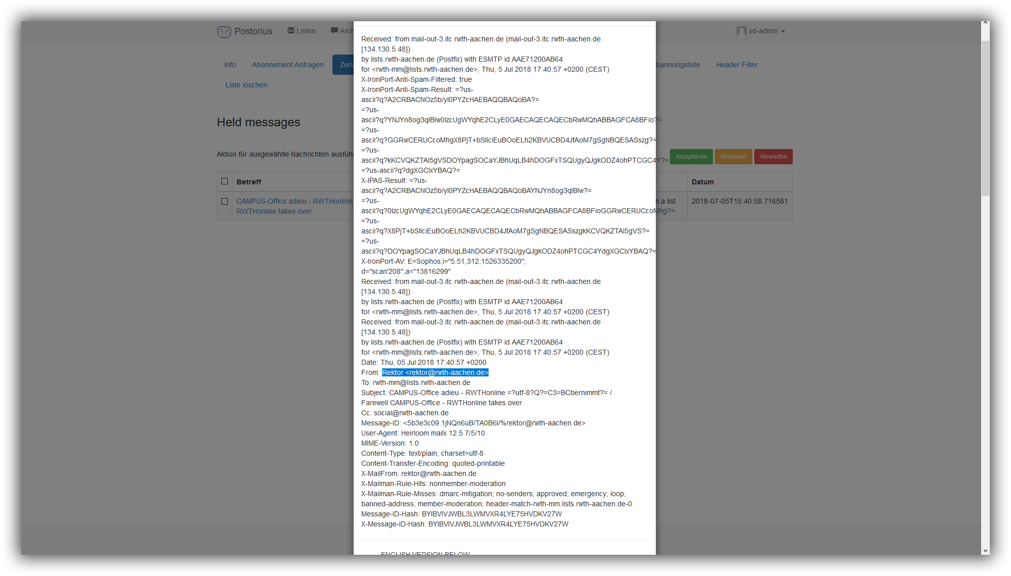 Um den E-Mail-Text zu kontrollieren,wählen Sie Zurückgehaltene Nachrichten und die betroffene Nachricht per klick auf den Betreff aus. Daraufhin taucht eine Info-Box auf, welches den Text der E-Mail anzeigt.