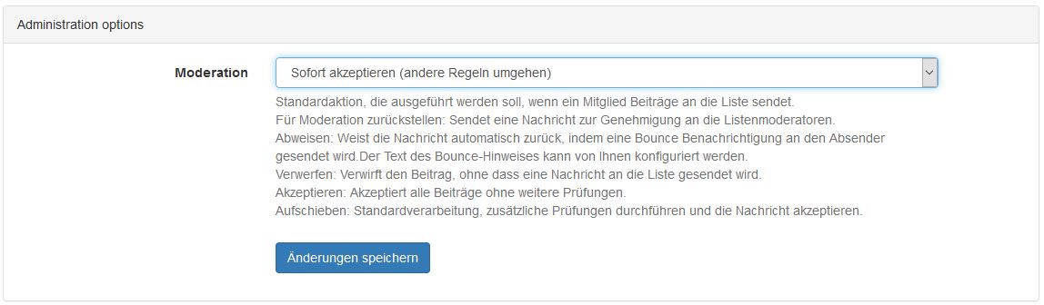 Hier wählt man die entsprechend gewünschte Einstellung aus. Möchte man, dass ein Nutzer ohne Moderation senden kann, so kann dieser die Einstellung "Sofort akzeptieren" erhalten.