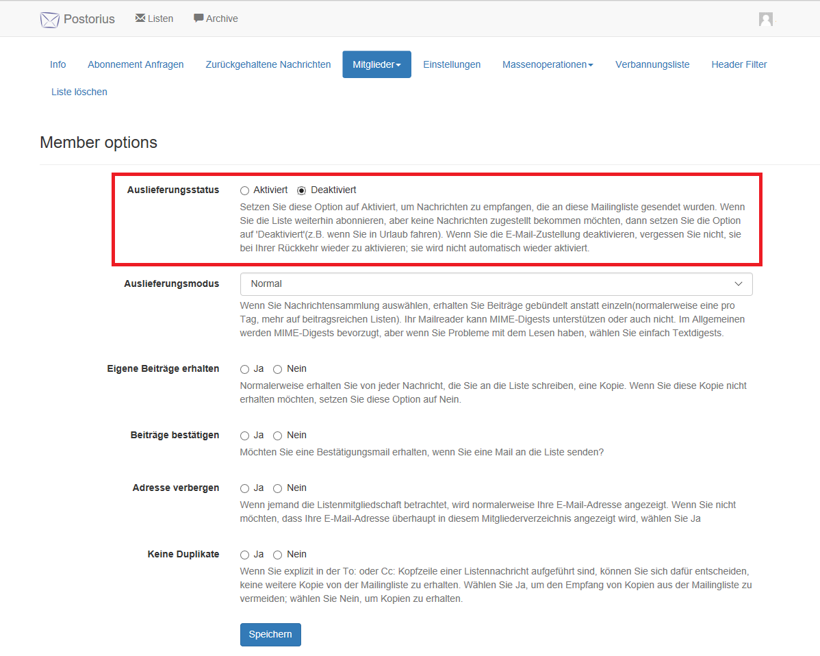 Unter Benutzeroptionen deaktivieren Sie den Auslieferungsstatus.