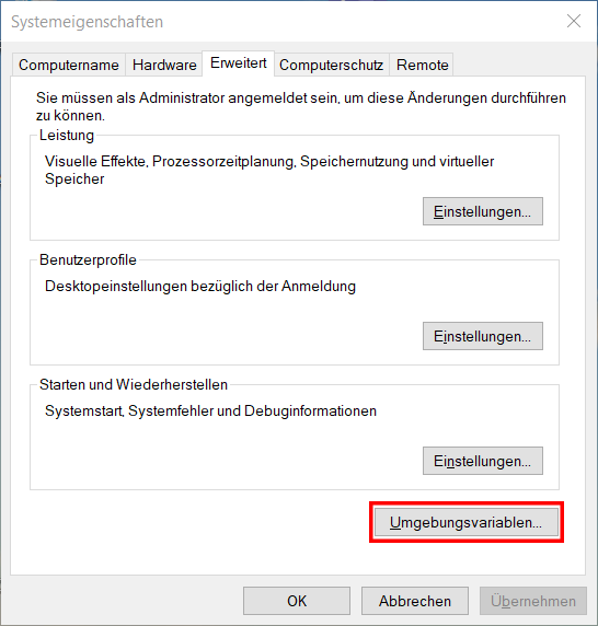 2. Im sich nun öffnenden Fenster “Umgebungsvariablen” auswählen