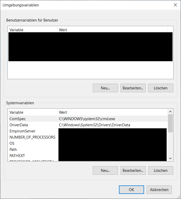 3. Im neuen Fenster werden nun alle systemweiten und benutzerweiten Variablen angezeigt. Je nach dem in welcher Umgebung die Variable gesetzt werden soll, kann durch einen Klick auf das entsprechende Feld “Neu…” nun eine Variable hinzugefügt werden. Durch die beiden anderen Flächen kann die in der Liste ausgewählte bestehende Variable bearbeitet oder gelöscht werden.
